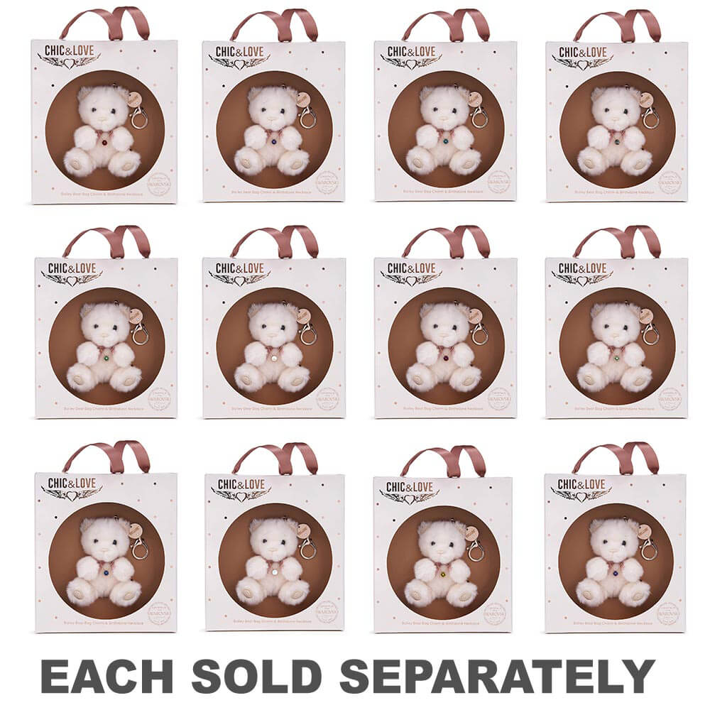 Bailey Bear Bag Charm og Swarovski Firthstone halskæde. Bailey Bear har et blødt premium plyss stof, komplimenteret af et roseguld satinbånd. Bagklippet har en roseguld hummerlås med en Swarovski Crystal Medallion. Halskæden er lavet af messing og er rosen forgyldt med en Swarovski -granat januar fødselssten. Præsenteret i en gaveæske med et roseguld satinhåndtag og mate segl finish. Funktioner folie stemplet og spotglansdetaljer.