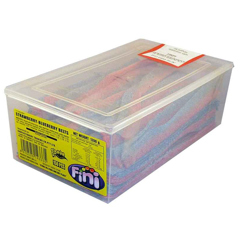 Fini Strawberry og Blueberry Belts er en lækker slikbehandling, der kombinerer de søde og saftige smag af jordbær og blåbær. Disse slikbælter har typisk et pulserende rødt og blåt farveskema, der repræsenterer de to frugtagtige smag. Den seige struktur og dejlige blanding af jordbær- og blåbærsmag gør dem til et populært valg for dem, der nyder en frugtagtig og sej slikoplevelse.