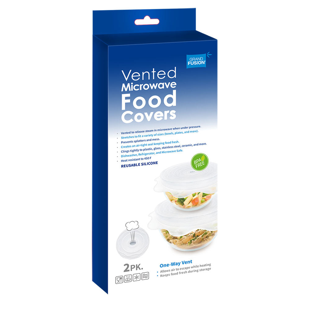 Heat up leftovers with the revolutionary Vented Silicone Microwave Food Covers from Grand Fusion. These stretchy microwave covers cover over any dish up to 30cm, creating an air tight seal. Suitable for microwave use up to 232C, the built in vents release steam as pressure builds.