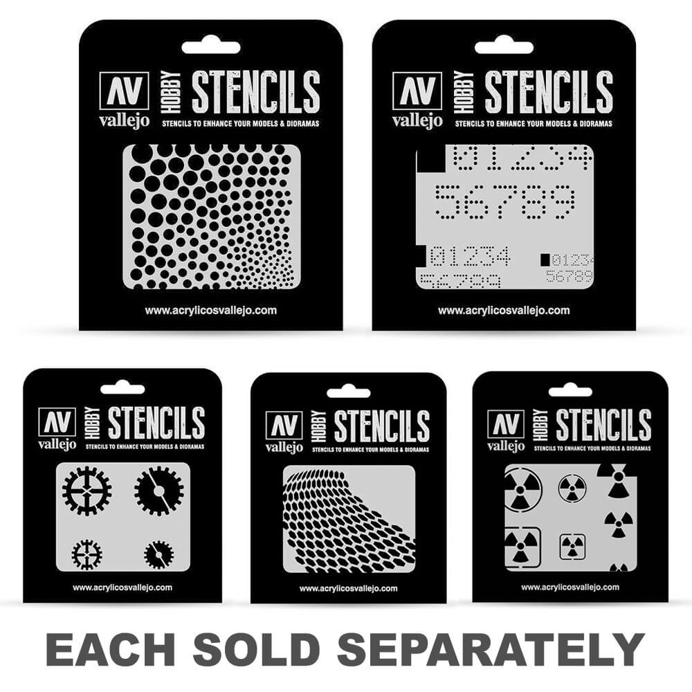 Vallejo Stencils offers a wide selection of references and themes for modellers and crafters. Available in several categories: AFV Markings: Badges, numbers, slogans, signs, unit and nationality markings designed for historical and modern armoured vehicles. Camouflages: Patterns for armoured vehicles and aircraft camouflages; available in several scales. Air Markings: Badges, numbers, unit and nationality markings, registries and surface effects designed for historical and modern aircraft. Lettering & Signs: Traffic signs, fonts and signs for dioramas, adverts, retail signs and graffities. Sci-Fi & Fantasy: Badges, numbers, effects, panels and patterns designed for Sci-Fi vehicles and spaceships. Texture Effects: Splashes, textures, cracks, stains and other physical texture and effects.