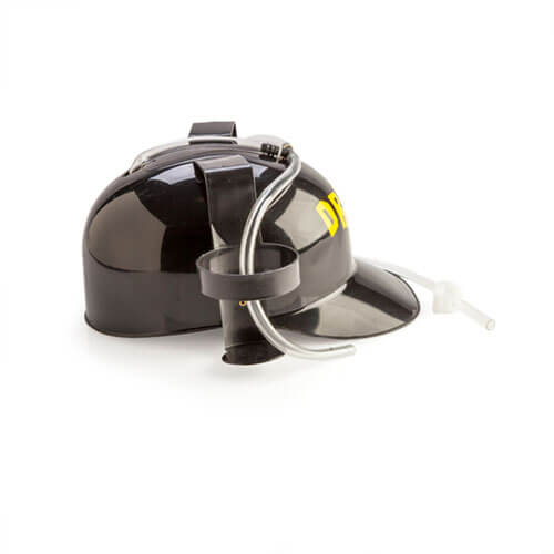 - Schwarzer Bierhelm mit leuchtend gelbem „Drunk AF“-Aufdruck