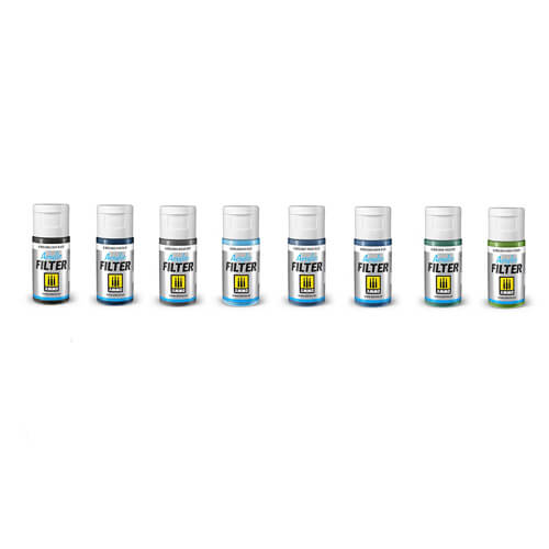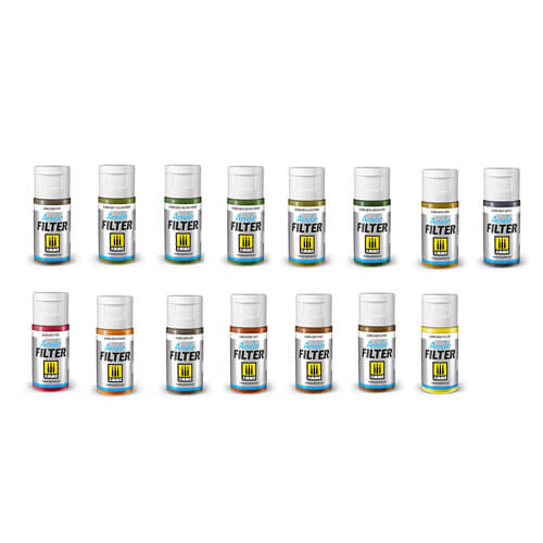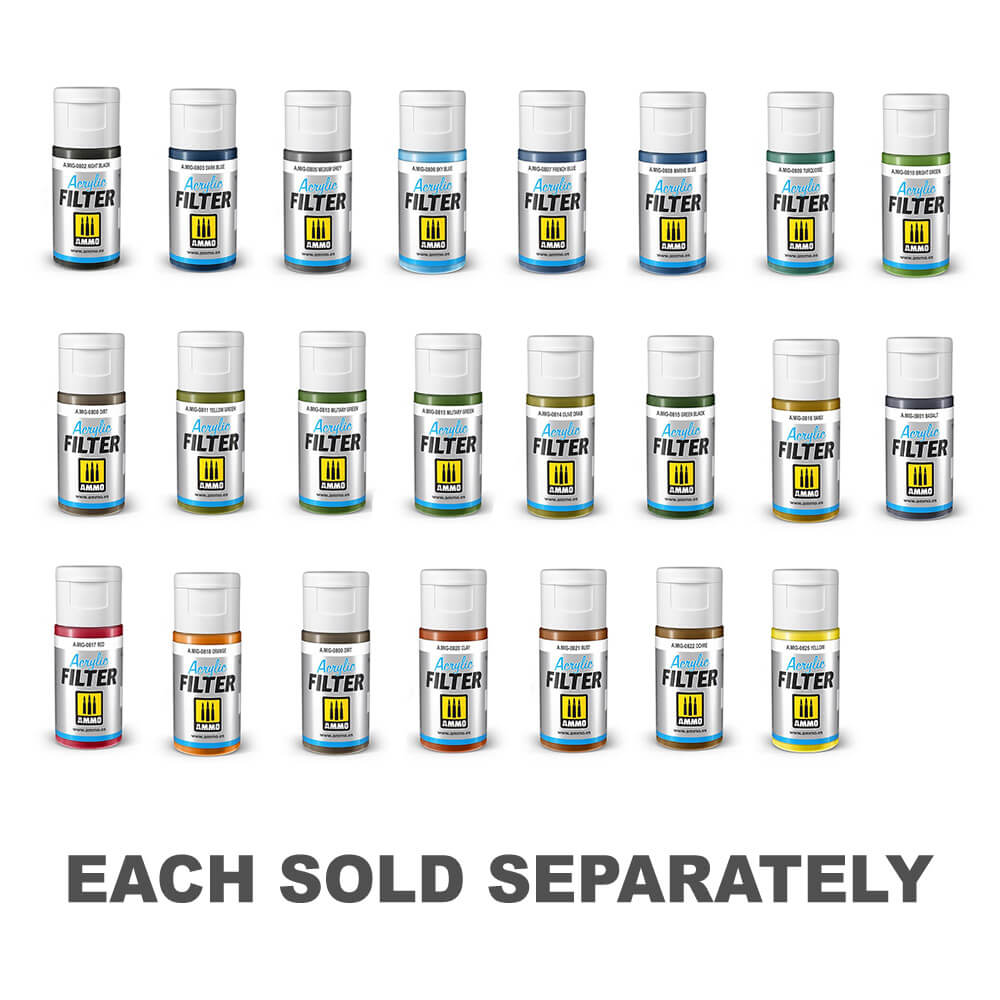 AMMOs neue Acrylfilter sind so konzipiert, dass sie direkt auf das Modell aufgetragen werden können. Mit dieser neuen Reihe können Sie Ihren Miniaturen Farbvariationen hinzufügen, verschiedene Tarnfarben harmonisieren oder Bereiche mit einem anderen Farbton hervorheben. Der Acrylfilter lässt sich einfach mit einem Pinsel auftragen, wodurch ein aufwändiges Abkleben entfällt. Befeuchten Sie den Pinsel mit dem Produkt und tragen Sie es auf, ohne die Oberfläche zu überfluten. Dank der innovativen Formulierung können die Acrylfilter während der verlängerten Trocknungszeit einfach und unkompliziert mit Wasser ausgebessert oder entfernt werden. Jeder Filter trocknet innerhalb von 24 Stunden vollständig. Diese vielseitigen Filter können auch per Airbrush aufgetragen werden, um unzählige Effekte zu erzielen. Dank der breiten Palette von 30 verfügbaren Farben müssen Sie keine komplexen Mischungen herstellen, das richtige Verdünnungsverhältnis einstellen oder den Farbton an den gewünschten Farbton anpassen. Jede Farbe kann untereinander gemischt oder mit anderen AMMO-Acrylfarben getönt werden