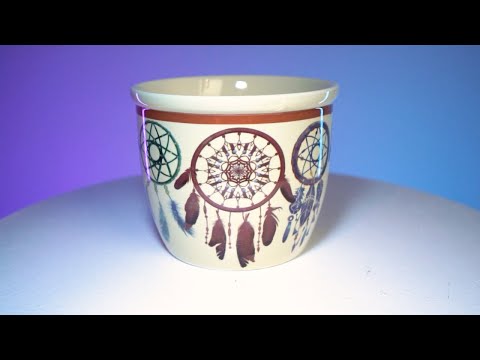 - Gefiedertes Traumfänger-Design auf einer cremefarbenen Schale.