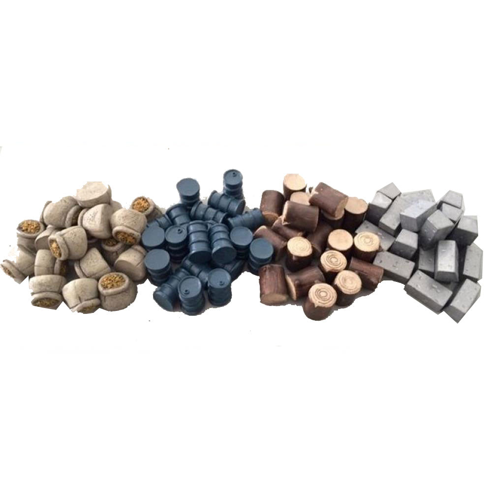 • Inclus sont 80 jetons: 20 sacs de grains (aliments), 20 lingots de fer (métal), 20 barils d'huile (huile), 20 bois haché (bois)