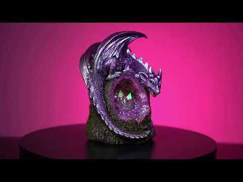 木の切り株の周りにカールした金属紫色のドラゴンを特徴とする魔法の逆流香容器バーナー。きらめくジオードは3つの顕著な結晶を囲みます。詳細な彫刻と色。 LEDを変更すると、このバーナーは美しい機能的飾りになります。