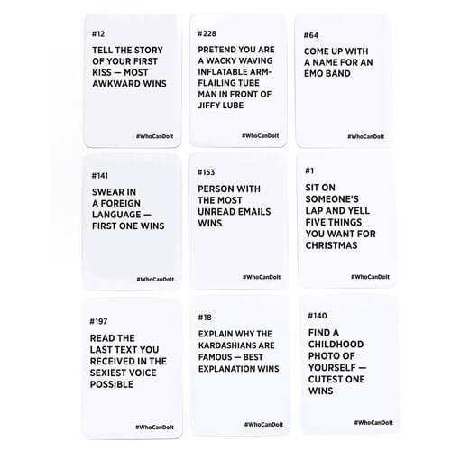 誰がそれを行うことができるか...グループ内の誰がそれをすることができるかを見るために250のアクションカードを含めます!裁判官の最高の印象をするために友達と競い、スプーンで水を飲み、携帯電話の背景をハゲの男の写真に変えてください。
