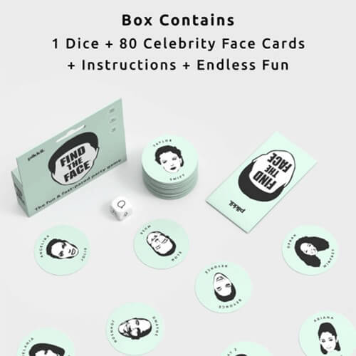 最初に有名な顔を見つけるという楽しくて速いペースのゲーム。含まれる:1つのサイコロ、80の有名人の顔カード、指示、無限の楽しみ!