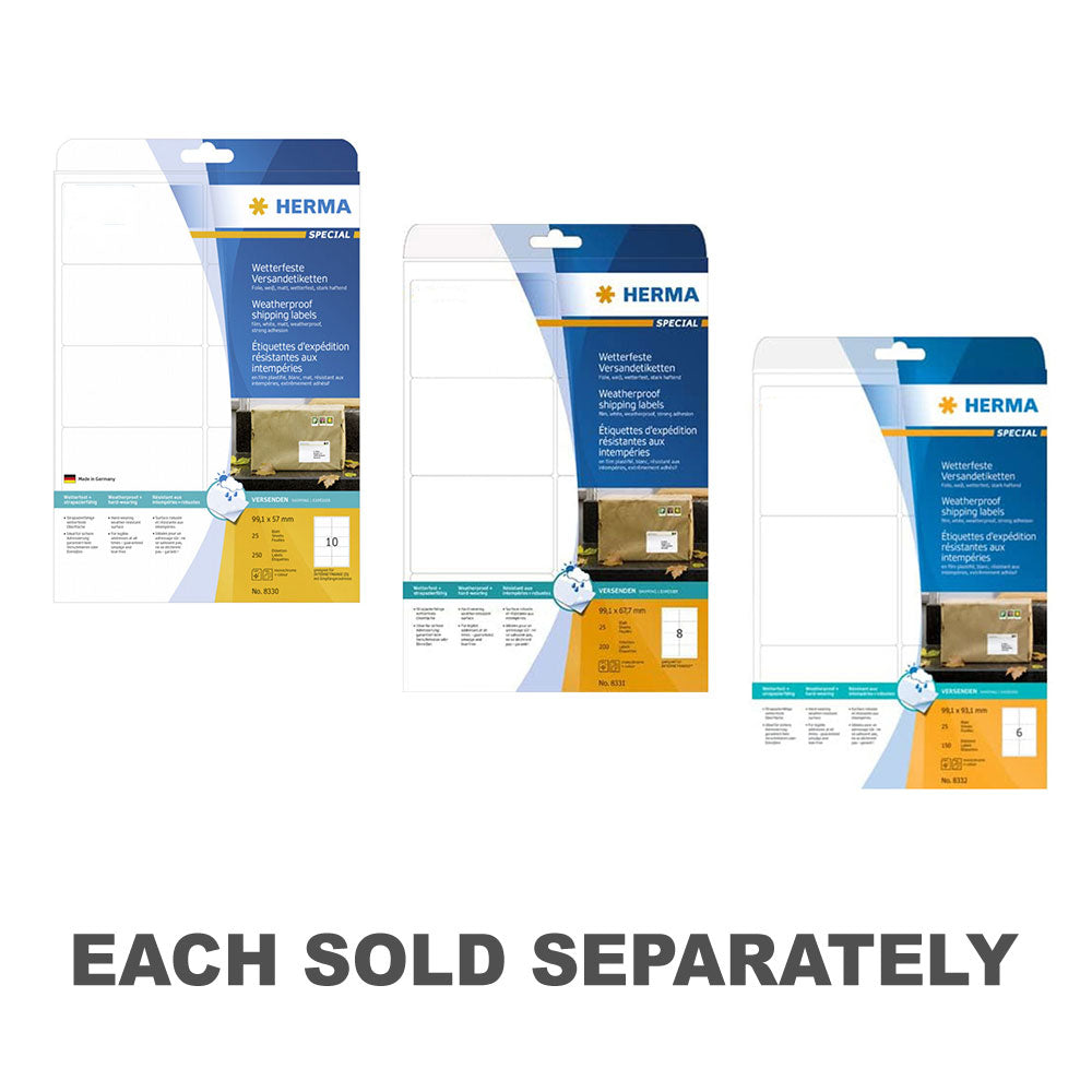 Ensure your packages arrive safely with Herma Weatherproof Shipping Labels! These A4-sized labels are designed to withstand harsh weather conditions, ensuring your shipping labels remain legible and intact during transit. With a durable white finish, these labels offer crisp, professional-looking prints for addresses, barcodes, or logos. Whether for shipping parcels, packages, or outdoor signage, these weatherproof labels offer reliability and durability for all your labeling needs. Get ready to protect your shipments with Herma Weatherproof Shipping Labels!