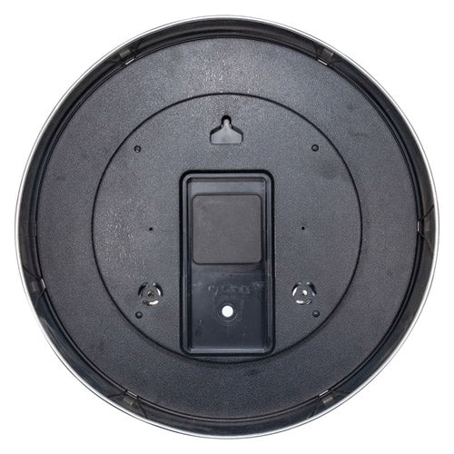 This wall clock has a brushed aluminium case that frames the white dial. The black markings and bold black and red hands make the time, temperature and humidity easy to read.