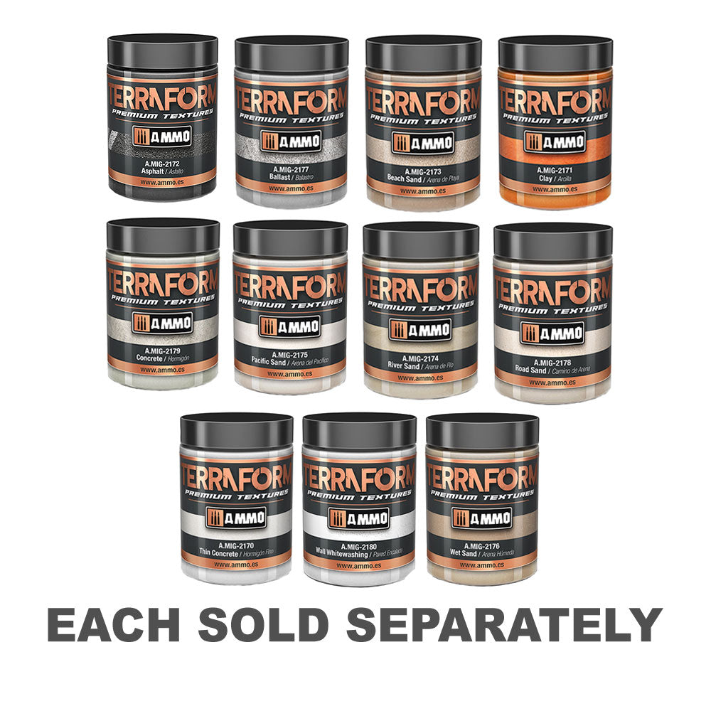 Med denne nye akrylformuleringen laget med naturlige mineraler, gjorde du at du autentisk kan gjenskape et bredt utvalg av teksturer, for eksempel betong, sand, asfalt, leire og ballast. Dette produktet, akryl, ikke-giftig og luktfritt, presenteres i 100 ml dunker. Den tørker helt innen 24 timer og kan blandes med andre lignende produkter fra vårt utvalg av teksturer. Det er egnet for enhver skala fra 1/16 til 1/48.