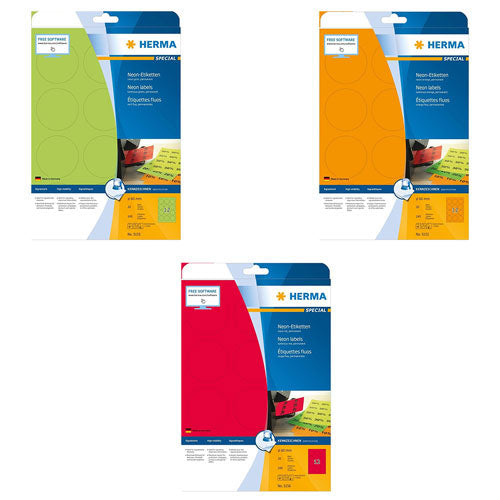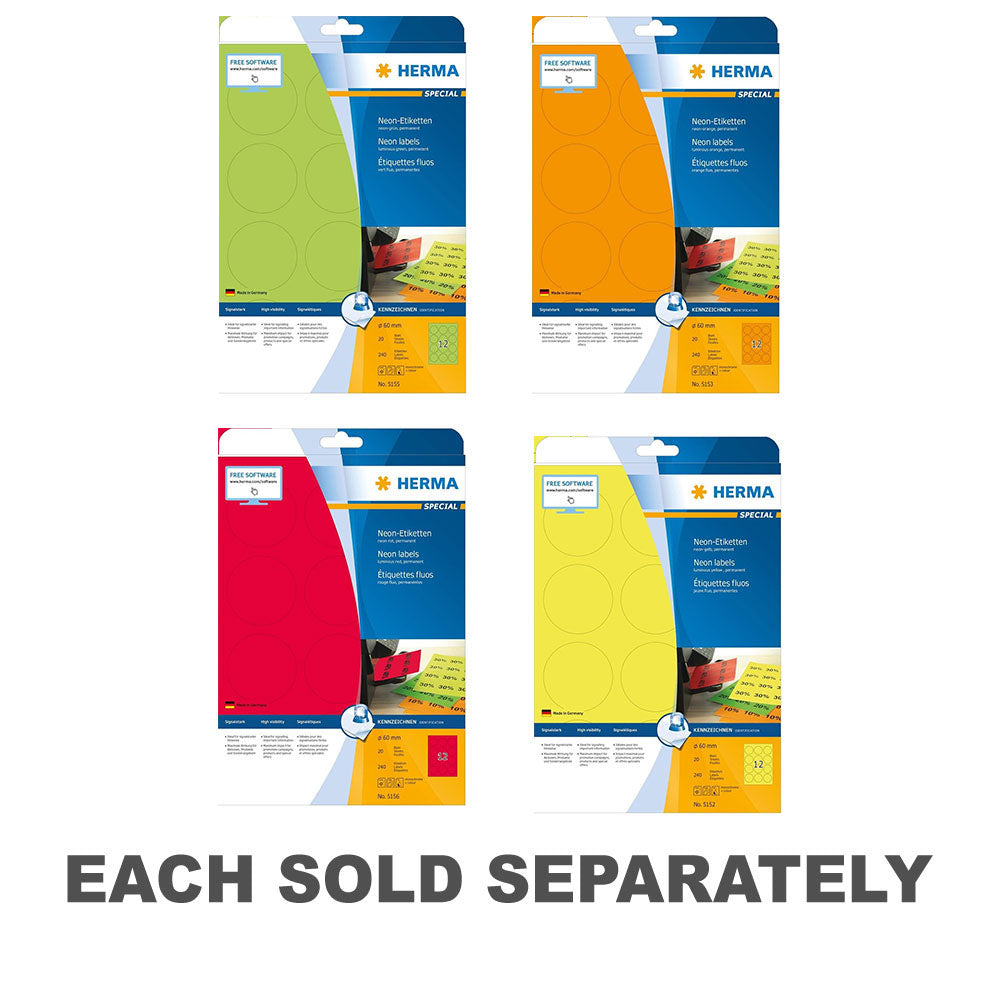 Add a pop of color and illumination to your labeling tasks with Herma Round Luminous Neon Labels! This pack includes 20 round labels, each measuring 60mm in diameter, featuring a luminous neon finish for high visibility and impact. Perfect for labeling, signage, or creative projects, these round neon labels stand out in low-light conditions or crowded environments, ensuring attention-grabbing results. Whether for business presentations, event decorations, or arts and crafts, these round luminous neon labels provide versatility and excitement for all your labeling needs. Get ready to light up your projects with Herma Round Luminous Neon Labels!