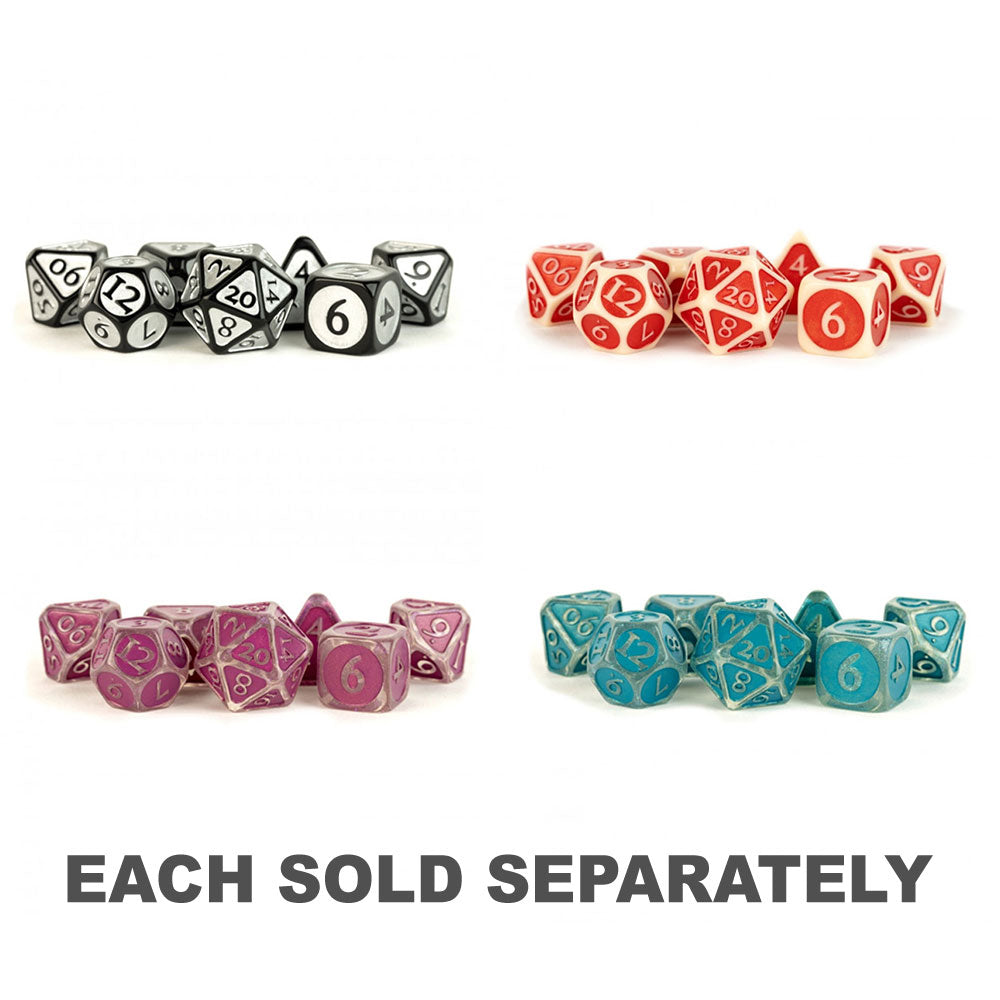 Cada conjunto é moldado em acrílico e depois cuidadosamente preenchido com uma bela tinta de esmalte. Recomendamos enrolar qualquer dado de metal em superfícies acolchoadas, como bandejas de dados acolchoadas.