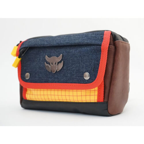 • Apresentando elementos de couro falso e jeans com acabamentos de nylon e um charme de metal fofo na frente /li>>