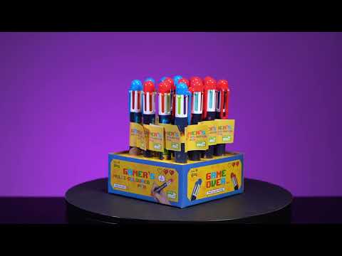 Nivå upp ditt skrivande med denna nyhetsspelspen! Har pixelikoner med text som läser 'Game Over'. Med 6 färger att skriva med: svart, blå, röd, orange, grön, lila.